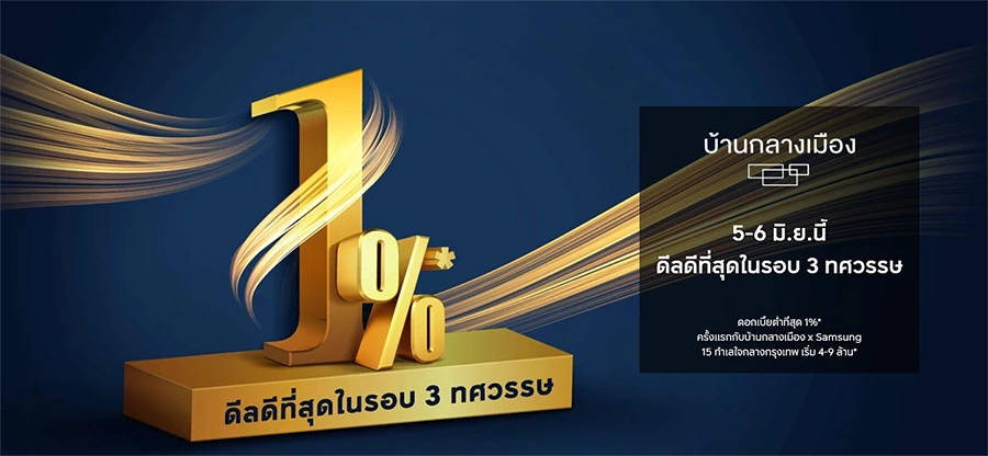5 - 6 มิถุนายน 2564 นี้ "ดีลดีที่สุดในรอบ 3 ทศวรรษ ดอกเบี้ยต่ำที่สุด 1%" ครั้งแรกกับบ้านกลางเมือง x Samsung พบบ้านรุ่นใหม่ที่มีชีวิต Magical Home 15 ทำเลใจกลางกรุงเทพ เริ่ม 4-9 ล้าน*