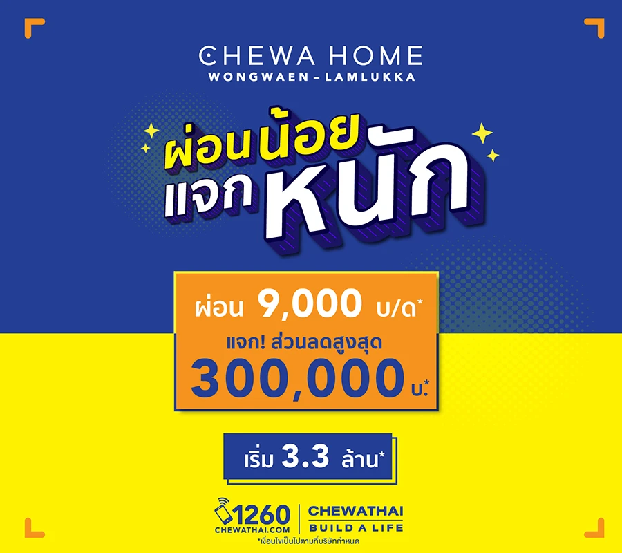 ผ่อนน้อย แจกหนัก "ชีวาโฮม วงแหวน - ลำลูกกา" ผ่อน 9,000 บาท/เดือน แจกส่วนลดสูงสุด 300,000 บาท เริ่ม 3.3 ล้านบาท