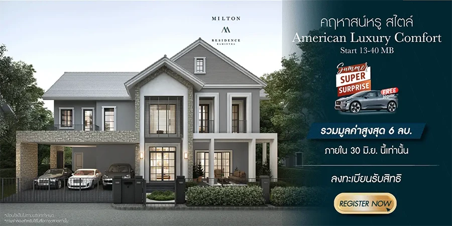 มิลตัน เรสซิเดนซ์ รามอินทรา คฤหาสน์หรูสไตล์ American Luxury Comfort เริ่มต้น 13 - 40 ล้านบาท กับโปรโมชั่น Summer Super Surprise ขยายสิทธิถึง 30 มิ.ย. นี้เท่านั้น!! ฟรี Jaquar I-PACE รวมมูลค่าสูงสุด 6,000,000 บาท