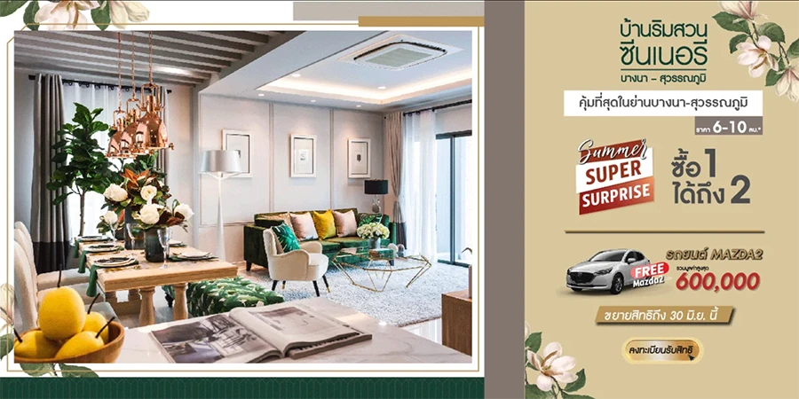 บ้านริมสวน ซีนเนอรี บางนา-สุวรรณภูมิ บ้านเดี่ยวคุ้มที่สุดในย่านบางนา-สุวรรณภูมิ เริ่มต้น 6 - 10 ล้านาบาท กับโปรโมชั่น Summer Super Surprise ซื้อ 1 ได้ถึง 2 ฟรี!! Mazda 2 รวมมูลค่าสูงสุด 600,000 บาท ถึง 30 มิ.ย. นี้เ เท่านั้น!