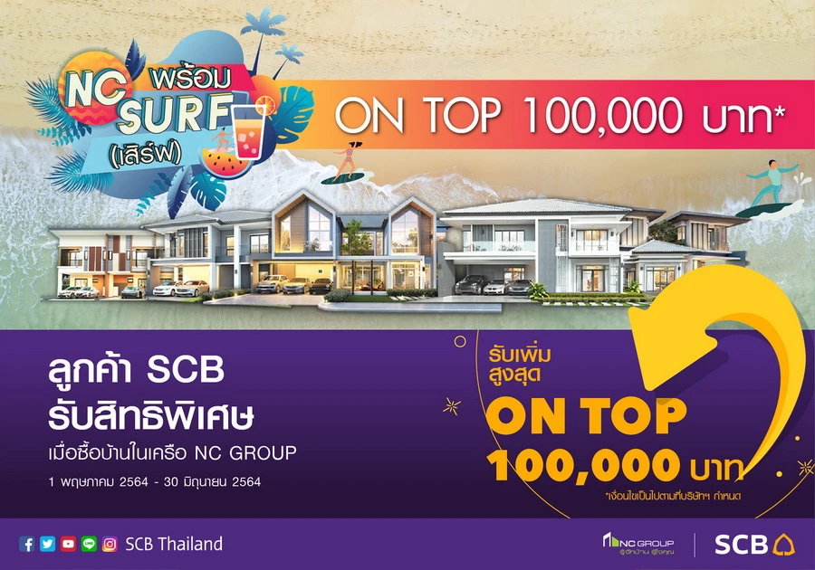 NC พร้อม Surf รับเพิ่มสูงสุด On Top 100,000 บาท* ลูกค้า SCB รับสิทธพิเศษ เมื่อซื้อบ้านในเครือ NC Group 1 พ.ค. - 30 มิ.ย. 64