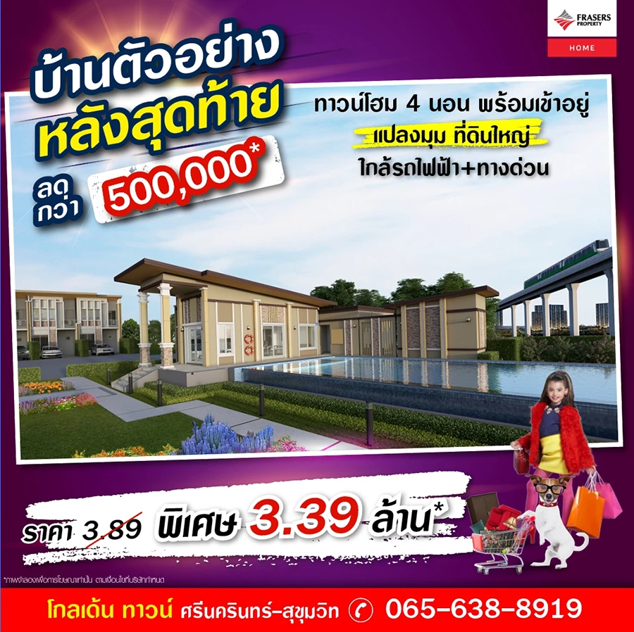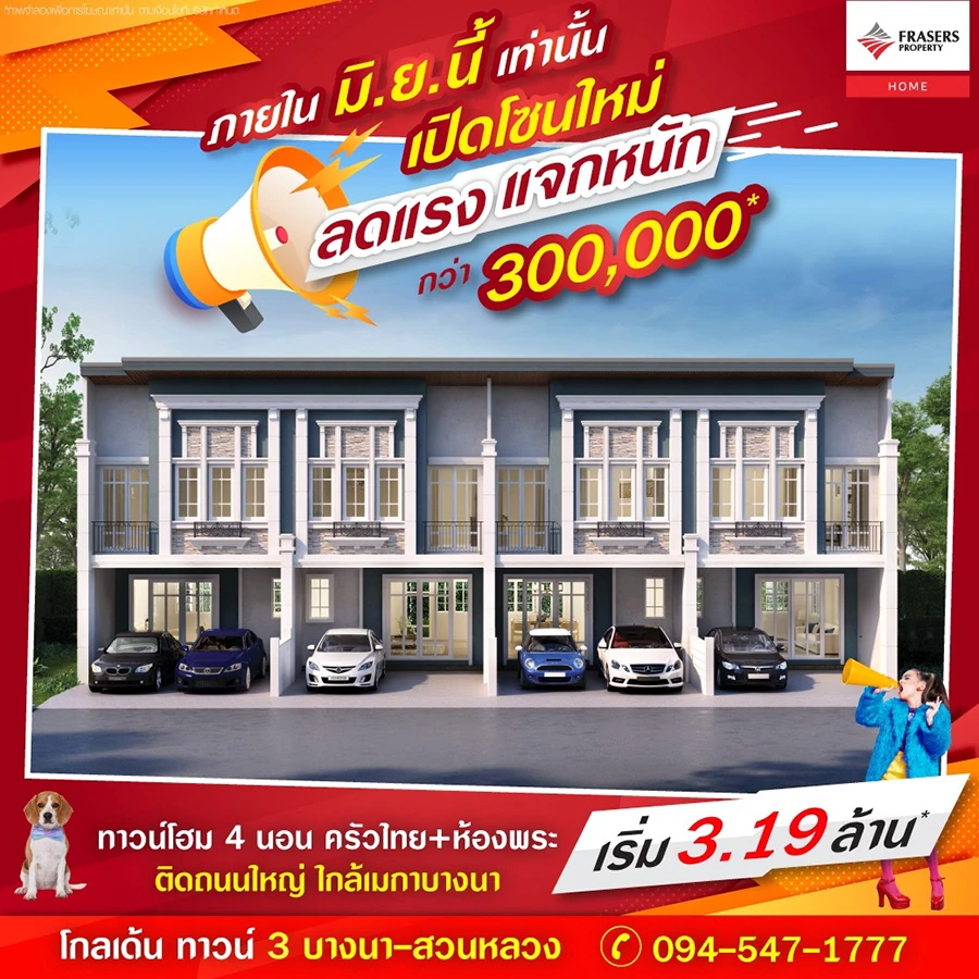 Promotion : 21-30 มิถุนายนนี้ ภายใน มิ.ย. นี้ เปิดโซนใหม่ EXTRA FUNCTION เหนือกว่า เพราะให้มากถึง 4 ห้องนอน 3 ห้องน้ำ พร้อมเพิ่มฟังก์ชันพิเศษ อาทิ ครั้งแรกกับห้องพระ ในทาวน์โฮม 2 ชั้น มีห้องอเนกประสงค์ชั้นล่างที่สามารถปรับเปลี่ยนเป็นห้องต่างๆ ได้ตามต้องการ พิเศษกับ GOLDEN KITCHEN นวัตกรรมครัวไทย ลดแรง แจกหนัก กว่า 300,000*เริ่ม 3.19 ล้าน*