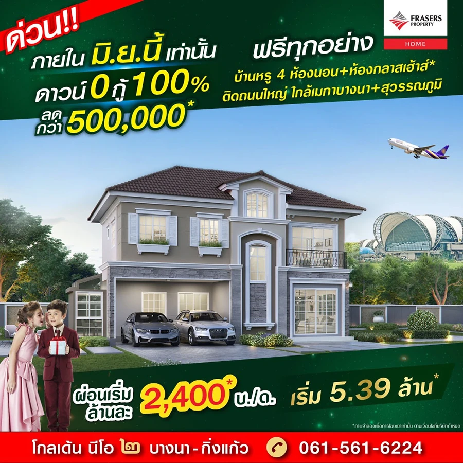 Promotion : 15-30 มิถุนายนนี้ ด่วน! ดาวน์ 0 กู้ 100%‼ บ้านหรู 4 นอน + ห้องพระ* ฟังก์ชั่นครบครัน อลังการสโมสร ติดถนนใหญ่ ใกล้ทางด่วน & สนามบินสุวรรณภูมิ ลดให้กว่า 500,000* ฟรีทุกอย่าง* ผ่อนเริ่มล้านละ 2,400 บาท/เดือน*