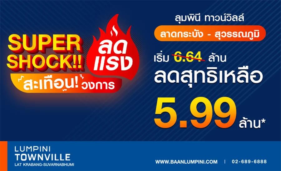 LPN จัดโปร SUPER SHOCK!! ลดแรงสะเทือนวงการบ้านแฝด กับโครงการ "ลุมพินี ทาวน์วิลล์ ลาดกระบัง - สุวรรณภูมิ" ลดราคาพิเสษ สุทธิเหลือ 5.99 ล้าน* จากราคาปกติ 6.64 ล้านบาท!!
