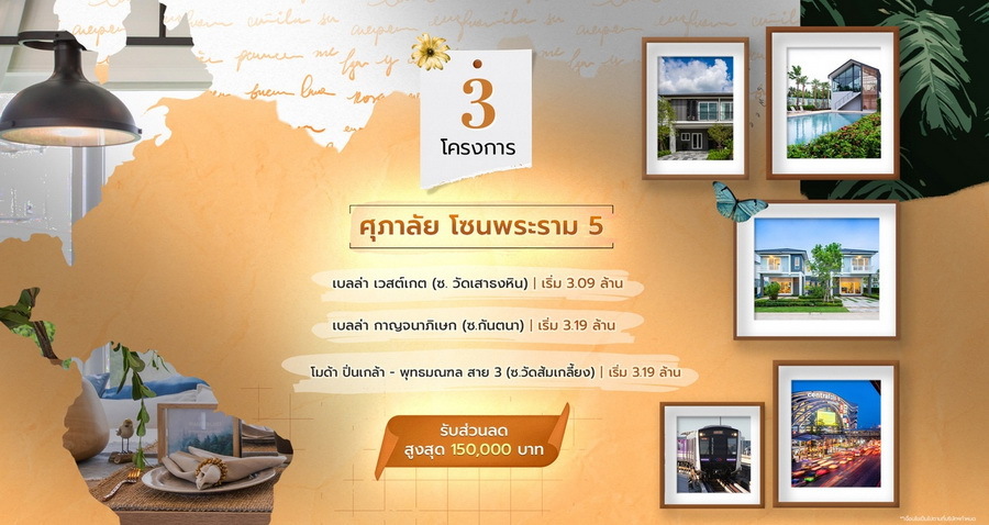 3 โครงการ ศุภาลัย โซนพระราม 5 เดินทางสะดวกใกล้ถนนกาญจนาภิเษก รถไฟฟ้า MRT สายสีม่วง และCentral WestGate พบกับบ้านที่ตอบทุกความต้องการ และ ฟังก์ชั่นคุ้มค่า จองตอนนี้รับโปรโมชั่นพิเศษสุด! รับส่วนลด ณ วันโอนฯ สูงสุด 150,000 บาท* ฟรี! ค่าใช้จ่ายวันโอนฯ ฟรี! ค่าส่วนกลาง 1ปี ฟรี! ค่ามิเตอร์ไฟ-มิเตอร์น้ำ กู้ไม่ผ่านยินดีคืนเงิน