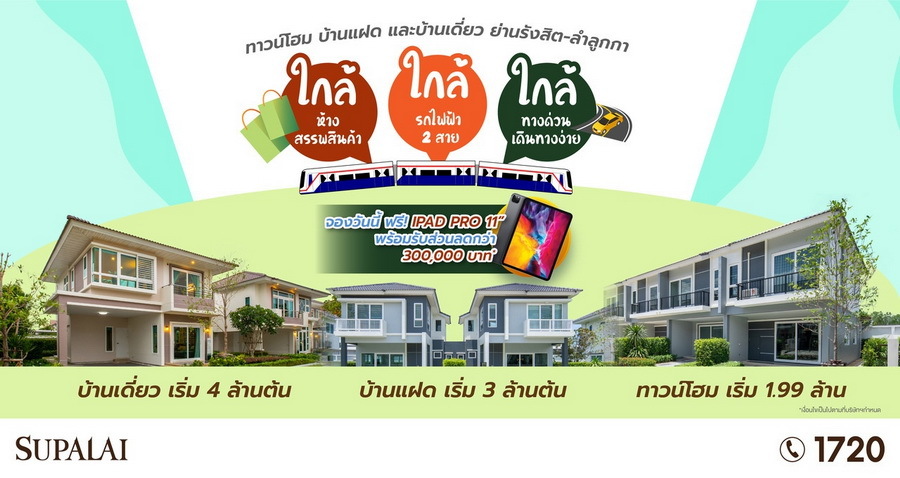 ทาวน์โฮม บ้านแฝด บ้านเดี่ยว ย่านรังสิต-ลำลูกกา ศุภาลัย การ์เด้นวิลล์ รังสิต คลอง 2 และศุภาลัย ไพรด์ วงแหวน-ลำลูกกา คลอง 6 พร้อมรับของแถมจัดเต็ม* โปร ศุภาลัย “ลด Unlock น็อกทุก Deal”