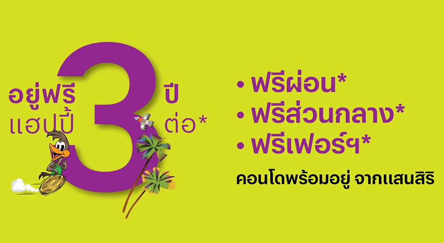 อยู่ฟรี 3 ปี แฮปปี้ 3 ต่อ สบายใจทันที 3 ปีไม่ต้องจ่าย รับโปรเต็มๆ ทุกโครงการ! คอนโดพร้อมอยู่จากแสนสิริ