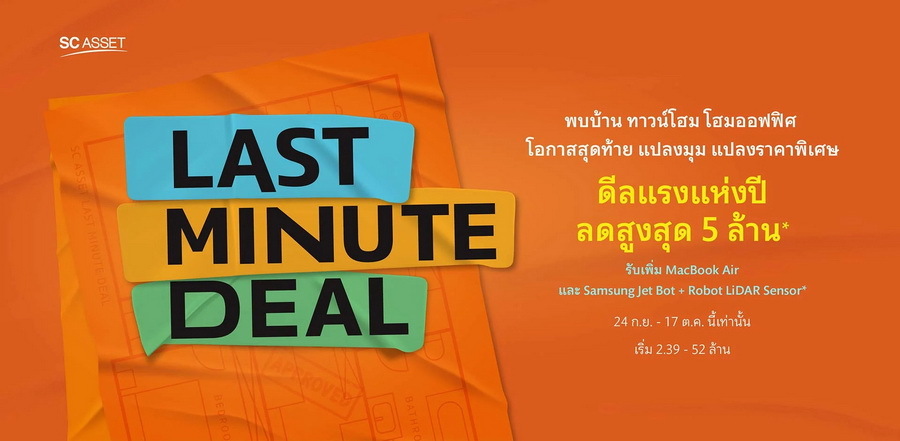 LAST MINUTE DEAL ดีลแรงแห่งปี ลดสูงสุด 5 ล้าน* รับเพิ่ม! MAC BOOK AIR และ SAMSUNG JET BOT + ROBOT LIDAR SENSOR* พบ 25 โครงการบ้าน ทาวน์โฮม โฮมออฟฟิศ โอกาสสุดท้าย แปลงมุม แปลงราคาพิเศษ