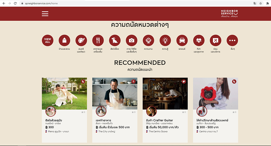 NEIGHBOR SERVICE มาร์เก็ตเพลสหนึ่งเดียวในไทย ที่เป็นศูนย์กลางซื้อ-ขาย สินค้าในรูปแบบของ "ความสามารถพิเศษ" เพื่อคนไทยในทุกไลฟ์สไตล์ จะสนใจจัดบอนไซ ทำบ่อปลา เพาะกระบองเพชร แต่งบ้าน อยากลองเป็นช่างสัก ฝึกเล่นเครื่องดนตรีจีนกู่เจิง (Guzheng) เปลี่ยนภาพถ่ายเป็น ภาพการ์ตูนสุดคิ้วท์ ตามหานักร้องสร้างความสุข ฝึกเล่นรูบิค หาคนปรึกษาเรื่องการเงิน เรียนภาษา ฝึกถ่ายภาพ หรือหาผู้เชี่ยวชาญดูแลผู้สูงอายุและผู้ป่วยที่บ้าน และอื่นๆ อีกมาก พบกันได้ที่ www.apneighborservice.com พร้อมเปิดกว้างต้อนรับทุกคนแล้ววันนี้