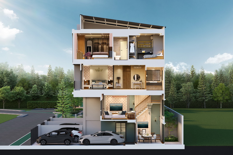 แบบทาวน์โฮม 3 ชั้นครึ่ง ดีไซน์สไตล์ร่วมสมัย ที่สามารถจอดรถได้ถึง 3 คัน ราคาพิเศษ ช่วงเปิด soft sale 5.99 ล้านบาท มอบส่วนลดสูงสุดถึง 5 แสนบาท