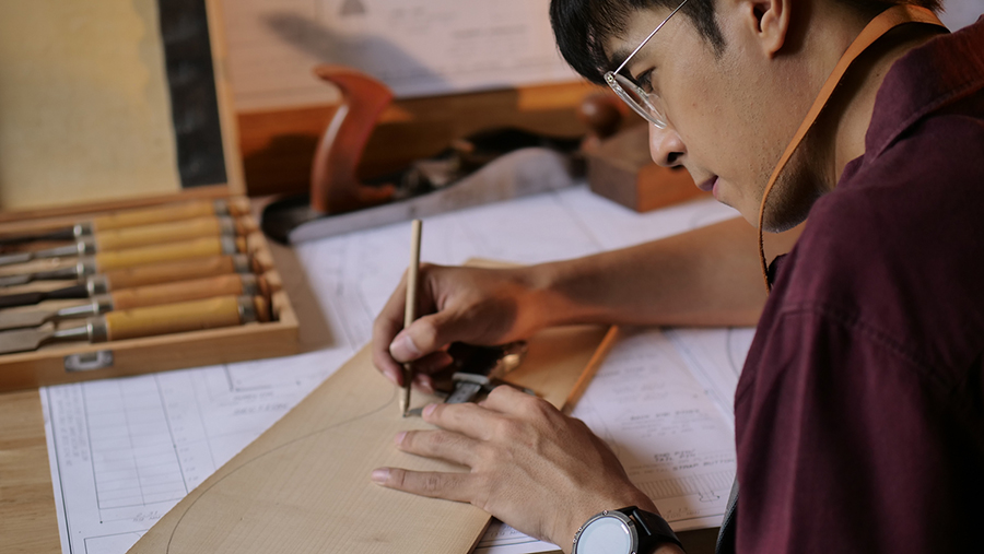“เสน่ห์ของกีตาร์แฮนด์คราฟต์ น่าจะเป็นเรื่องของแพชชั่น หรือความหลงใหล ความชื่นชอบในงานไม้ เป็นอะไรที่แปลกประหลาดมาก เขามาเป็นแผ่นไม้แล้วเราก็ทำให้กลายเป็นเครื่องดนตรีได้ ผมไม่ใช่แค่รักกีตาร์ แต่ ผมอยากสร้างเขาขึ้นมา ทุกครั้งเวลาที่ทำกีตาร์เสร็จ ผมจะรู้สึกว่า นี่คือความสุข” ไต้ฝุ่น เผยถึงความรักในงานคราฟต์ที่ต่อเนื่องมาอย่างยาวนานกว่า 20 ปี