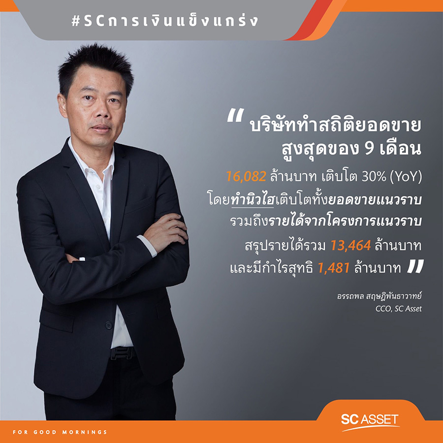 นายอรรถพล สฤษฎิพันธาวาทย์ ประธานเจ้าหน้าที่ด้านสนับสนุนองค์กร บริษัท เอสซี แอสเสท คอร์ปอเรชั่น จำกัด (มหาชน) หรือ SC เปิดเผยผลการดำเนินงานในรอบ 9 เดือนที่ผ่านมาว่า “ด้วยพอร์ตแนวราบที่แข็งแกร่ง ส่งผลให้การดำเนินงานของบริษัทเติบโตทำนิวไฮ ทั้งยอดขายรวมและยอดขายแนวราบ รวมถึงรายได้จากโครงการแนวราบ ซึ่งมาจากปัจจัยหลัก คือ ความเชื่อมั่นในแบรนด์ SC และการส่งมอบสินค้าและบริการคุณภาพมาตรฐานสูงที่ทำให้มีการตอบรับที่ดีในทุกระดับราคา ส่งผลให้บริษัทมียอดขายรวม 16,082 ล้านบาท เติบโต 30% (YoY) โดยสัดส่วนหลักกว่า 80% มาจากยอดขายแนวราบ 13,268 ล้านบาท เติบโต 17% (YoY) และเป็นสถิติยอดขายสูงสุดของ 9 เดือน ซึ่งกลุ่มสินค้าหลัก ได้แก่ บ้านราคามากกว่า 10 ล้านบาทขึ้นไป เติบโต 37% (YoY) และมียอดขายแนวสูง 2,814 ล้านบาท เติบโต 172% (YoY)
