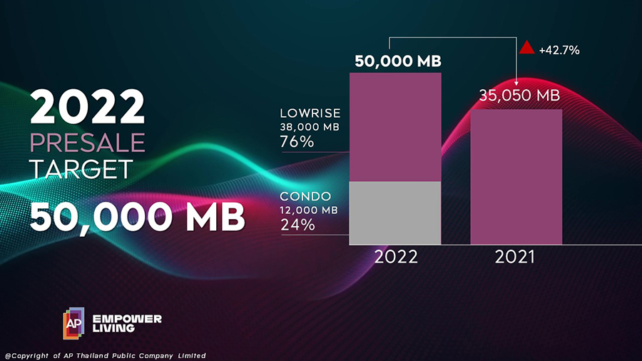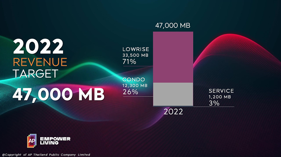 โดยในปี 2565 จะเป็นปีที่เอพี ไทยแลนด์มีแผนเปิดตัวโครงการใหม่สูงที่สุดในอุตสาหกรรม โดยวันนี้เอพีมีแผนเปิดตัวแล้วทั้งสิ้น 65 โครงการ มูลค่ากว่า 78,000 ล้านบาท ถือเป็นจำนวนโครงการใหม่ที่มากที่สุดตั้งแต่เคยดำเนินธุรกิจมา แบ่งเป็นทาวน์โฮม 29 โครงการ มูลค่า 25,200 ล้านบาท บ้านเดี่ยวจำนวน 26 โครงการ มูลค่า 35,600 ล้านบาท คอนโดมิเนียม 5 โครงการ มูลค่า 13,000 ล้านบาท และโครงการในต่างจังหวัด 5 โครงการ มูลค่า 4,200 ล้านบาท ส่งผลให้ทั้งปีเอพีจะมีโครงการพร้อมขายทั้งกทม.และต่างจังหวัดมากกว่าถึง 182 โครงการ มูลค่ากว่า 149,000 ล้านบาท โดยตั้งเป้ายอดขาย 50,000 ล้านบาท เป้ารายได้รวม 100% JV ที่ 47,000 ล้านบาท