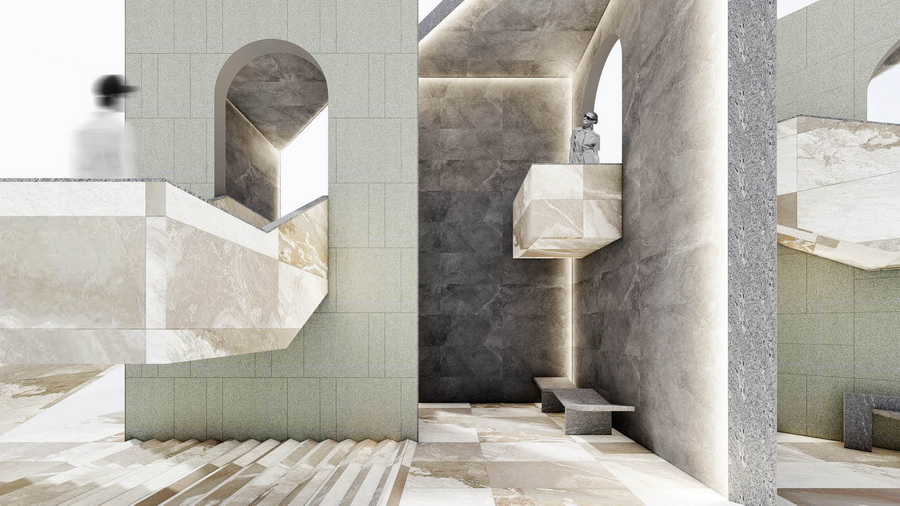 เกิดขึ้นจากการตีความแต่งเติมพื้นที่ว่าง หรือ Space ในสไตล์ของ ACa (Designer) เปลี่ยนที่พักอาศัยธรรมดาเป็น “Conceptual Space ของ Living Unit” โดยจำลองการอยู่อาศัยในห้องต่าง ๆ ผ่านกระเบื้องหลากรุ่นจาก WDC (Supplier) เช่น MEDIATE กระเบื้องลวดลายใหม่ที่เกิดจากการพัฒนาร่วมกันกับสถาปนิกระดับโลกเพื่อความสวยงามกับทุกสถาปัตยกรรม และกระเบื้องกันลื่นนวัตกรรม MICRO TECH ที่นุ่มนวลเมื่อแห้ง แต่จะหยาบขึ้นเมื่อเปียกน้ำด้วยคุณสมบัติ Coating Agent นำมาแต้มสีสันพื้นที่อาศัยโดยแสดงลวดลายกระเบื้องและผืนกระเบื้องอย่างชัดเจน ให้อิสระความคิดสร้างสรรค์ได้เปิดกว้างจินตนาการบนพื้นที่ใช้สอยได้จริง ประกอบกับการวางเส้นทาง (Routing) ให้เดินผ่านห้องต่าง ๆ ตั้งแต่ชั้นหนึ่งที่สามารถมองขึ้นไปชั้นสอง หรือ เดินขึ้นบันได ซึ่งเป็นไอเดียการออกแบบที่ชวนให้ถึงนึกสถาปัตยกรรมจากซีรีส์ Squid Game และเป็นไฮไลต์ของ Thematic Pavilion นี้
