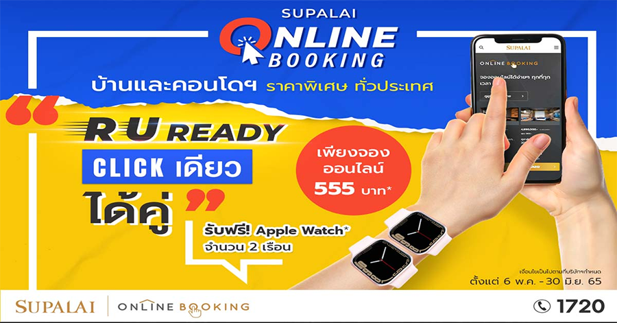 SUPALAI ONLINE BOOKING ช้อปออนไลน์ กับ "R U READY...Click เดียว ได้คู่" ศุภาลัย ปล่อยโปรฯ เอาใจคนชอบเบิ้ล จองเพียง 555 บาท ผ่าน Online Booking ตั้งเเต่วันนี้ - 30 มิ.ย. 65 รับฟรี! Apple Watch Series 7 GPS ถึง 2 เรือน รวมมูลค่า 29,800 บาท (เฉพาะโครงการและยูนิตที่เข้าร่วมเท่านั้น)