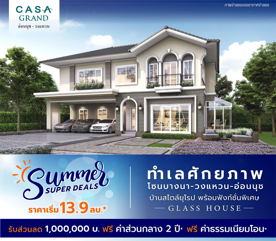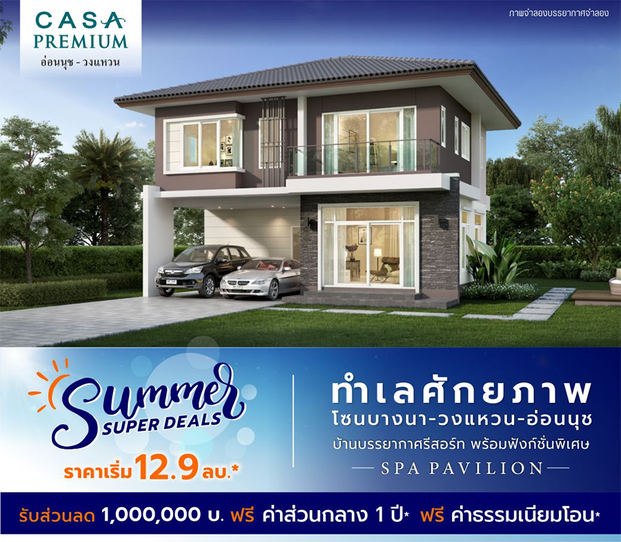 แคมเปญ SummerSuperDeals "คาซ่า พรีเมี่ยม อ่อนนุช-วงแหวน" 2 หลังพิเศษ บ้านเดี่ยว โซนถนนเมน ด้านหน้าโครงการ บรรยากาศรีสอร์ท สไตล์โมเดิร์น พร้อมฟังก์ชั่นพิเศษ Spa Pavilion ราคาเริ่ม 12.9 ลบ.*