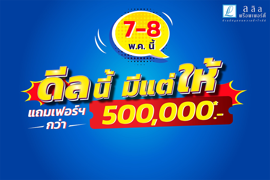 ดีลนี้ มีแต่ให้ 7-8 พ.ค. 65 ที่ลลิล พร็อพเพอร์ตี้ ให้คุณเป็นเจ้าของบ้านบนทำเลคุณภาพ พร้อมรับของสมนาคุณมูลค่าสูงสุด 5 แสนบาท*" กับโครงการทาวน์โฮม บ้านเดี่ยว บ้านแนวคิดใหม่ ทุกโครงการ! ทุกทำเล! เริ่ม 2-10 ล้านบาท*