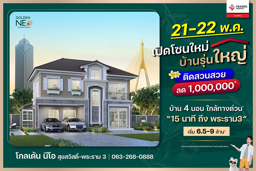 21-22 พ.ค. โกลเด้น นีโอ สุขสวัสดิ์-พระราม 3 โซนใหม่ บ้านรุ่นใหญ่ ติดสวนสวย บ้าน 4 ห้องนอน ใกล้ทางด่วน เพียง 15 นาที ถึงพระราม 3 ลด 1,000,000 บาท*