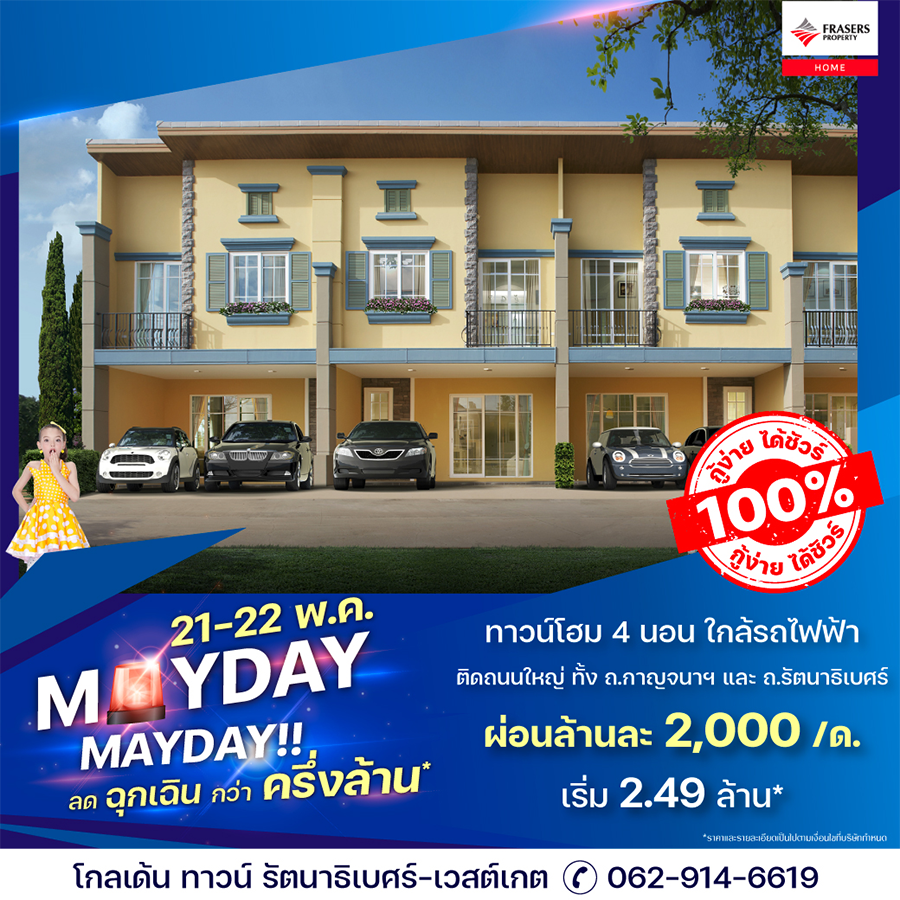 21 - 22 พ.ค. นี้ โกลเด้น ทาวน์ รัตนาธิเบศร์-เวสต์เกต ทาวน์โฮม 4 ห้องนอน พร้อมอยู่ ฟังก์ชันครบครัน มอบโปรฯ MAYDAY MAYDAY กู้ง่าย ได้ชัวร์ 100% ผ่อนน้อย ล้านละ 2,000 บาท/เดือน* ลดฉุกเฉิน ให้อีกกว่า ครึ่งล้าน* เริ่ม 2.49 ล้าน*