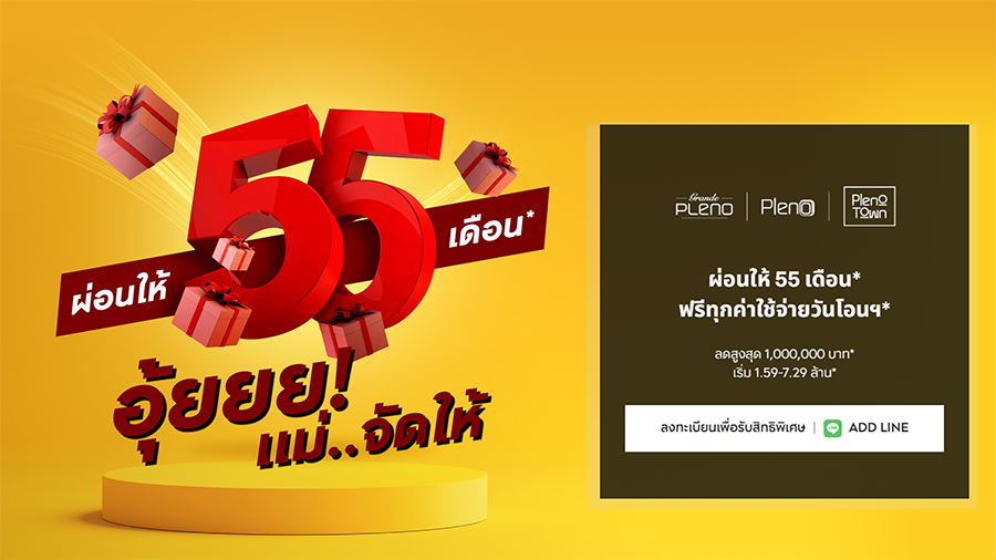 โปรโมชั่น อุ้ยยย! แม่จัดให้ ผ่อนให้ 55 เดือน* พ.ค.นี้ แม่จัดให้ ผ่อนให้เลย นานถึง 55 เดือน* กับแบรนด์ Pleno, Grande Pleno และ Pleno Town ราคาเริ่มต้น 1.59 - 7.29 ล้านบาท*