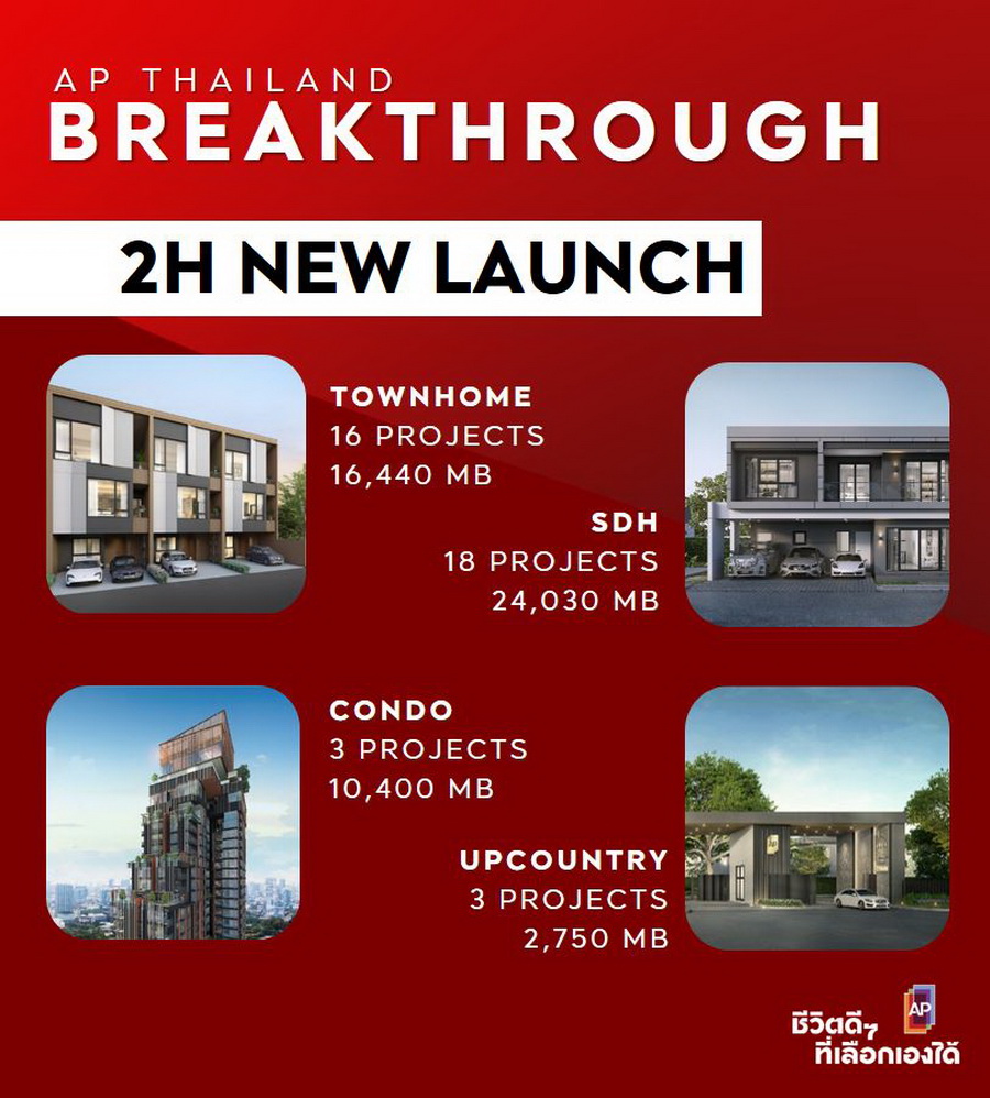 ทั้งนี้ บริษัทฯ ยังคงเดินหน้าตามแผน BREAKTHROUGH ทุกข้อจำกัด โดยในครึ่งปีหลัง บริษัทฯ จะมีโครงการพร้อมขายกระจายทั่วกรุงเทพฯ และในต่างจังหวัดรวมกันมากถึง 160 โครงการ มูลค่าพร้อมขายกว่า 122,350 ล้านบาท ซึ่งประกอบด้วย 40 โครงการใหม่ มูลค่ารวมประมาณ 53,620 ล้านบาทที่เตรียมจะเปิดตัวในครึ่งปีหลังนี้ โดยแบ่งเป็นทาวน์โฮม 16 โครงการ มูลค่า 16,440 ล้านบาท บ้านเดี่ยวจำนวน 18 โครงการ มูลค่า 24,030 ล้านบาท คอนโดมิเนียม 3 โครงการ มูลค่า 10,400 ล้านบาท และโครงการในต่างจังหวัด 3 โครงการ มูลค่า 2,750 ล้านบาท และ 120 โครงการที่อยู่ระหว่างการก่อสร้างและขาย ซึ่งทั้งหมดสะท้อนได้ถึงการเตรียมพร้อมในทุกๆ ด้านของเอพี ไม่ว่าจะเป็นการบริหารจัดการต้นทุน การวางแผนเรื่องแรงงาน ตลอดจนการบริหารจัดการ เพื่อรองรับกับจำนวนโครงการที่มีปริมาณมากควบคู่กับภาวะความผันผวนที่เกิดขึ้น