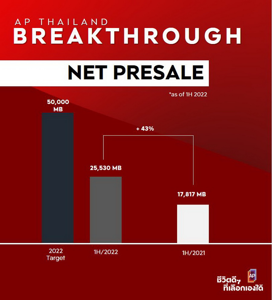 นายวิทการ จันทวิมล รองกรรมการผู้อำนวยการ สายงานกลยุทธ์องค์กรและการสร้างสรรค์ บมจ. เอพี ไทยแลนด์ กล่าวว่า ครึ่งปีแรกที่ผ่านมาถึงแม้ในขณะที่สถานการณ์การแพร่ระบาดจะเริ่มคลี่คลายลง แต่ทุกคนทั่วโลกกำลังต้องเผชิญกับภาวะเงินเฟ้อ ราคาสินค้าที่แพงขึ้นที่มีผลกระทบต่อระบบเศรษฐกิจแทบทุกประเทศ ซึ่งสิ่งที่เอพีทำมาโดยตลอดคือการมอนิเตอร์ทุกสถานการณ์อย่างใกล้ชิด เพื่อนำมาปรับแผนการทำงาน ตลอดจนการบริหารจัดการต้นทุน เพื่อคงราคาขายดังเดิมไม่ให้กระทบไปยังลูกค้าเรามากที่สุด ส่งผลให้ผลงานในครึ่งปีแรกบริษัทฯ สามารถสร้างนิวเรคคอร์ดได้อีกครั้ง โดยมียอดขายมากถึง 25,530 ล้านบาท เพิ่มขึ้นกว่า 43% หากเทียบกับครึ่งปีก่อนหน้า โดยเฉพาะสินค้าซูเปอร์สตาร์อย่างบ้านเดี่ยวและทาวน์โฮมที่เติบโตแบบก้าวกระโดด ส่งผลให้ภาพรวมสินค้าแนวราบในครึ่งปีแรกเติบโตขึ้นกว่า 25% ขณะที่กลุ่มธุรกิจคอนโดมิเนียม ยอดขายก็ปรับตัวดีขึ้นกว่าเกือบ 3 เท่า ถือเป็นการส่งสัญญาณบวกที่ดีให้กับตลาดฯ ซึ่งทั้งหมดเป็นการเติบโตแบบ Organic Growth ที่สะท้อนให้เห็นถึงศักยภาพในการวางแผนองค์กรให้พร้อมตั้งรับกับทุกสภาวะได้อย่างชัดเจน