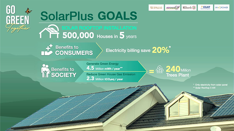 ธนาคารกสิกรไทยจับมือ 4 พันธมิตร ได้แก่ การไฟฟ้าฝ่ายผลิตแห่งประเทศไทย บริษัท พีอีเอ เอ็นคอม สมาร์ท โซลูชั่น จำกัด บริษัท ศุภาลัย จำกัด (มหาชน) และบริษัท อินโนพาวเวอร์ จำกัด เดินหน้า GO GREEN Together สนับสนุนการใช้พลังงานสะอาดของประชาชน เปิดตัวโครงการ SolarPlus ติดตั้งโซลาร์รูฟให้แก่ประชาชนฟรี เพื่อผลิตและขายไฟฟ้าเป็นครั้งแรกในไทย นำร่องโครงการที่หมู่บ้านศุภาลัย ตั้งเป้าติดตั้ง 500,000 หลังทั่วประเทศ ภายใน 5 ปี เตรียมวงเงินสินเชื่อให้แก่ผู้ลงทุน 50,000 ล้านบาท คาดว่าจะสามารถลดการปล่อยก๊าซเรือนกระจกลงได้ 2.3 ล้านตันคาร์บอนไดออกไซด์เทียบเท่าต่อปี เพื่อสนับสนุนให้คนไทยเปลี่ยนมาใช้พลังงานสะอาดสู่การเป็น Net Zero ตามเป้าหมายของประเทศ