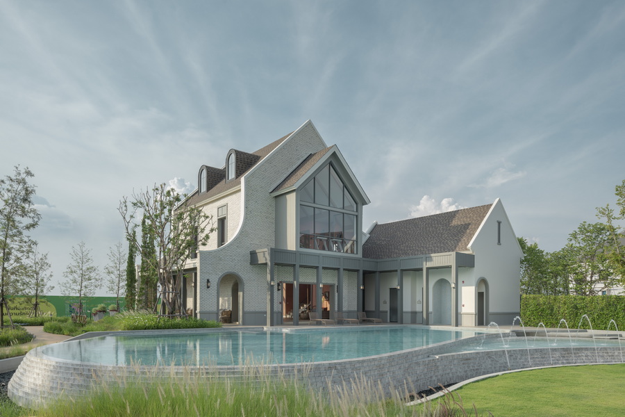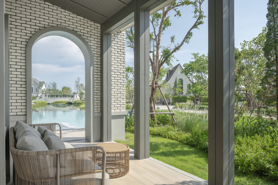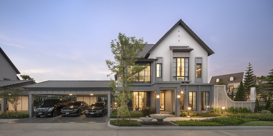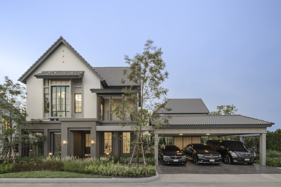สราญสิริ เทียนทะเล 30 Facade Design ออกแบบในสไตล์ Modern Farmhouse ที่โดดเด่น มีเอกลักษณ์ ให้ความรู้สึกอบอุ่น Gable Roof หรือหลังคาทรงจั่ว ให้ความรู้สึกอบอุ่น เพิ่มช่องแสงธรรมชาติด้วย Frame Pattern Long Window พร้อมกระจกเขียวตัดแสง ลดทอนความร้อนเข้าสู่ตัวบ้าน