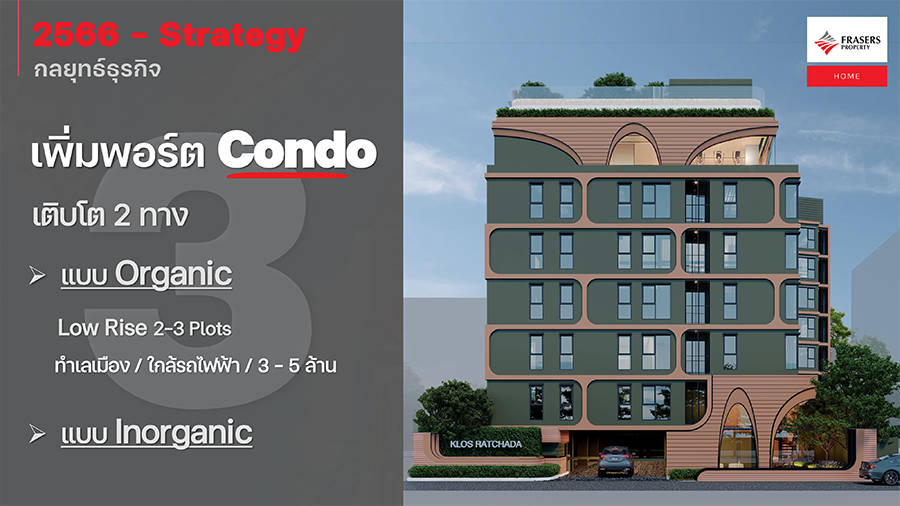 3. บุกตลาดคอนโด Low Rise เนื่องจากเห็นโอกาสทางการตลาดหลังสถานการณ์โควิด-19 คลี่คลายที่ตลาดคอนโดมิเนียมเริ่มกลับมาฟื้นตัวอีกครั้ง โดยเฉพาะโครงการคอนโดมิเนียม Low Rise ระดับราคา 3-5 ล้านบาทที่มีสัดส่วนดีมานด์เพิ่มมากที่สุดในปี 2565 ในขณะที่สินค้าคงเหลือในตลาดกลับมีไม่เพียงพอกับความต้องการที่เพิ่มขึ้น โดยบริษัทฯ มีแผนพัฒนาโครงการคอนโด Low Rise ด้วยโลเคชันตั้งอยู่ในเมืองและใกล้รถไฟฟ้าภายใต้ชื่อแบรนด์ใหม่ ซึ่งจะเปิดตัวเร็ว ๆ นี้