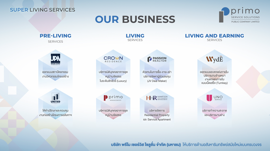 สำหรับ บริษัท พรีโม เซอร์วิส โซลูชั่น จำกัด (มหาชน) หรือ PRI เป็นผู้ดำเนินธุรกิจให้บริการที่เกี่ยวเนื่องกับอสังหาริมทรัพย์แบบครบวงจรชั้นนำของประเทศ มีประสบการณ์กว่า 11 ปี ปัจจุบัน ดำเนินธุรกิจภายใต้ 3 กลุ่มธุรกิจหลัก ได้แก่