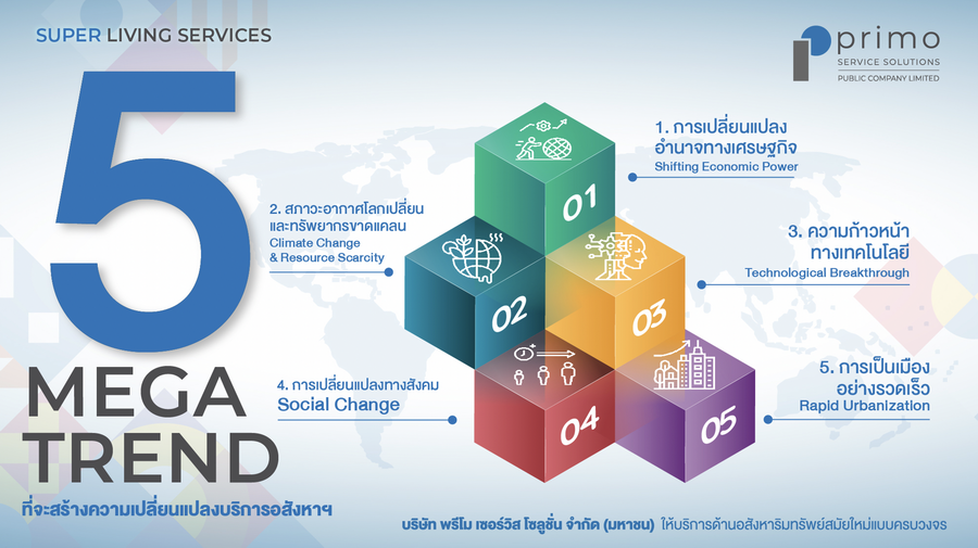 นางสาวจตุพร วิไลแก้ว ประธานเจ้าหน้าที่บริหาร บริษัท พรีโม เซอร์วิส โซลูชั่น จำกัด (มหาชน) หรือ PRI ผู้นำธุรกิจบริการด้านอสังหาริมทรัพย์สมัยใหม่แบบครบวงจร เปิดเผยว่า จากสถานการณ์ความเปลี่ยนแปลงด้านต่างๆ ทั่วโลก มีเมกะเทรนด์ที่อาจเกี่ยวข้องกับธุรกิจที่เกี่ยวเนื่องกับบริการอสังหาริมทรัพย์ใน 5 ด้านหลัก ได้แก่