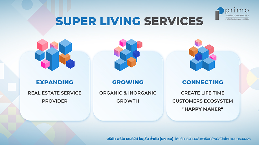 ในปี 2566 บริษัทจึงมีแผนการเติบโตภายใต้แนวคิด “Super Living Service” ขยายขอบเขตธุรกิจบริการใหม่ๆ ทั้งกลุ่มต้นน้ำ กลางน้ำ และปลายน้ำ ในหลากหลายมิติ ได้แก่