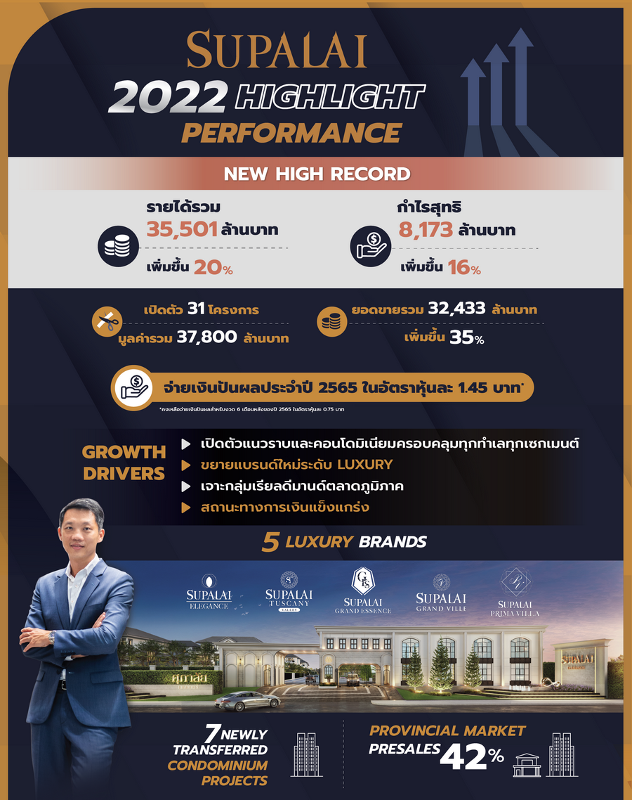 นายไตรเตชะ ตั้งมติธรรม กรรมการผู้จัดการ บริษัท ศุภาลัย จำกัด (มหาชน) กล่าวว่า ภาพรวมการดำเนินงานในปี 2565 ของบริษัทฯ สามารถทำผลงานได้เติบโตดีอย่างมาก ถือว่าประสบความสำเร็จเกินเป้าที่ตั้งไว้ โดยสามารถสร้างสถิติใหม่ New High ให้กับบริษัทฯ อีกครั้ง ทั้งรายได้ กำไร และยอดโอนกรรมสิทธิ์ หลังจากเคยทำสถิติรายได้และกำไรสูงสุดไปแล้วในปี 2564 โดยในปี 2565 เติบโตมาจากการฟื้นตัวจากความต้องการซื้อที่อยู่อาศัย และการสนับสนุนของมาตรการของภาครัฐและสถาบันการเงิน สะท้อนให้เห็นถึงความเชื่อมั่นและกำลังซื้อของลูกค้า รวมทั้งแผนการเปิดตัวโครงการใหม่ในกลุ่มสินค้าแนวราบและคอนโดมิเนียมเป็นไปตามแผนที่ตั้งไว้