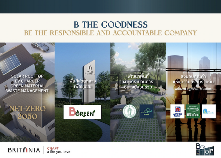3. B The Goodness มุ่งมั่นเป็นองค์กรที่รับผิดชอบต่อสังคม ทั้งในโครงการและชุมชนรอบด้าน อาทิ โครงการ CRAFT PARK สร้างพื้นที่สีเขียวสาธารณะเพื่อชุมชน ซึ่งเป็นโมเดลความร่วมมือของภาคเอกชน ภาคสังคม และชุมชน ตั้งแต่จุดเริ่มต้นตั้งแต่การออกแบบ ลงมือทำ ตลอดจนเดินหน้าเพื่อสิ่งแวดล้อมภายใต้โครงการ B GREEN มุ่งสู่เป้าหมาย Net Zero ในปี 2050 ผ่านการดำเนินงานตลอดห่วงโซ่คุณค่าตั้งแต่ต้นน้ำ คือ การออกแบบ เลือกใช้วัสดุฉลากเขียว และการก่อสร้าง การเพิ่มพื้นที่สีเขียว การจัดการขยะ จนถึงปลายน้ำ คือ สนับสนุนการใช้พลังงานสะอาด ตั้งเป้าติดตั้งโซลาร์ รูฟท็อป ณ คลับเฮ้าส์ทุกโครงการ และติดตั้งจุดเชื่อมต่อ EV Charger ให้กับบ้านทุกหลัง เพื่อส่งต่อคุณค่าของความรู้สึกภาคภูมิใจ ในการเป็นส่วนหนึ่งของการช่วยรักษาโลก จากการเลือกซื้อบ้านที่คำนึงถึงการสร้างสิ่งแวดล้อมที่ดี