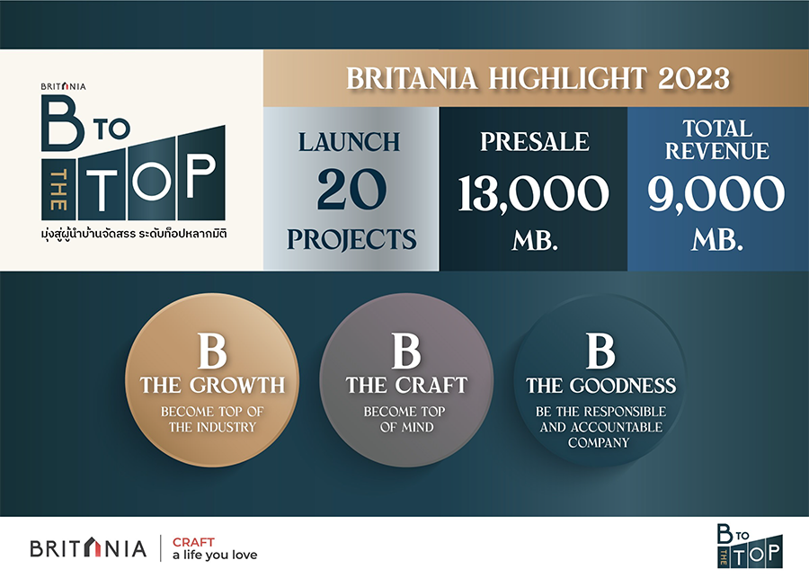 บริทาเนีย หรือ BRI ประกาศความสำเร็จปี 2565 กวาดกำไรสุทธิ All Time High แตะ 1,471 ล้าน ปักธงปี 2566 เดินหน้าลุยต่อเนื่อง กางแผนธุรกิจ “B To The Top” สู่เป้าหมายผู้นำบ้านจัดสรร ระดับท็อปหลากมิติ ด้วยกลยุทธ์ 3 B ประเดิมด้วย B The Growth ขึ้นแท่นผู้นำธุรกิจบ้านจัดสรร เปิดตัวโครงการใหม่ All Time High 20 โครงการ มูลค่าโครงการรวม 22,500 ล้าน ยกทัพบุกทุกทำเลทั้งกรุงเทพฯ-ปริมณฑล-EEC-หัวเมืองใหญ่ ทุกเซ็กเมนท์ ต่อด้วย B The Craft สร้างประสบการณ์ CRAFTED EXPERIENCE พร้อมยกระดับมาตรฐานการบริการทั้งก่อนและหลัง การขายอย่างครบวงจร สุดท้าย B The Goodness เป็นองค์กรรับผิดชอบต่อชุมชนและสังคม ตั้งเป้ายอดขายปี 2566 กว่า 13,000 ล้าน พร้อมเป้ารายได้รวม 9,000 ล้าน เติบโตอย่างต่อเนื่อง