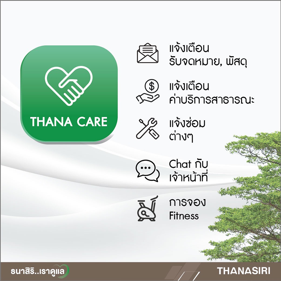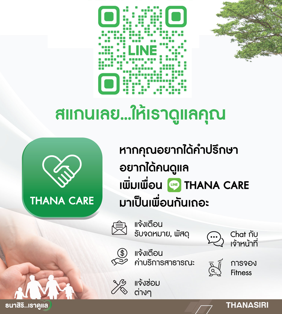 THANA CARE เริ่มมาจากความมุ่งมั่นที่จะพัฒนา และดูแลคุณภาพชีวิตที่ดีในการอยู่อาศัย เราจึงคิด และออกแบบการบริการสำหรับการดูแลผู้อยู่อาศัยในการใช้ชีวิตให้ทุกปัญหากลายเป็นเรื่องสะดวก เป็นเรื่องง่าย สำหรับการให้บริการดังกล่าว ครอบคลุมทุกบริการ ทั้งการติดต่อเจ้าหน้าที่ การซ่อมบำรุง ระเบียบการพักอาศัย การแจ้งข่าวประชาสัมพันธ์ การบริการสาธารณะต่างๆ การจองบริการฟิตเนส เป็นต้น รวมถึงในกรณีที่ท่านเจ้าของบ้านอยากได้ที่ปรึกษา หรือคำแนะนำเกี่ยวกับบ้านให้นึกถึง THANA CARE