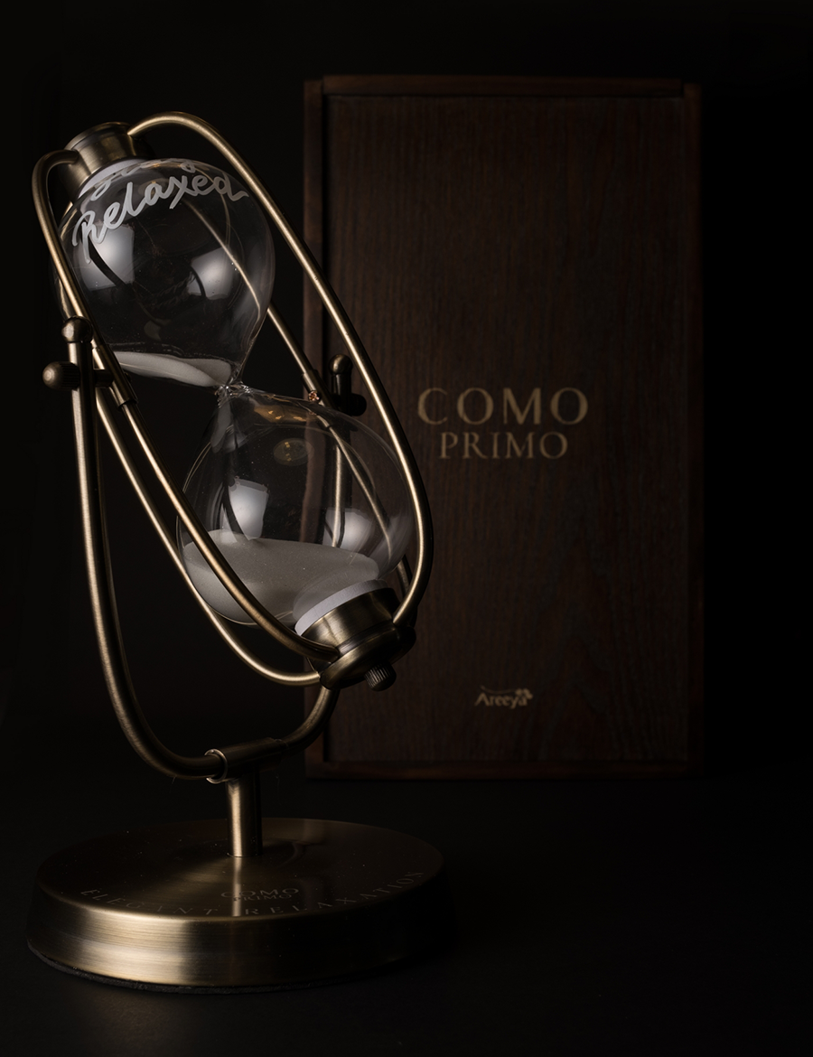 ไอเทมอันดับที่สองจาก COMO PRIMO เป็นนาฬิกาทรายดีไซน์เท่มาเป็น Home Cure ชูแนวคิดโดนใจคนทำงานอย่าง “Stop The Time: หยุดเวลาเครียด ให้เวลาพัก” ชวนเปิดประสบการณ์หยุดเวลาวุ่นวายและปล่อยใจไปกับกิจกรรมผ่อนคลาย เพียงคว่ำนาฬิกาทรายการพักผ่อน 30 นาทีจะเริ่มต้นขึ้น บนนาฬิกายังมีข้อความ “Stay Relaxed” เพื่อตอกย้ำถึงการพักผ่อน และให้ความสำคัญกับ Quality Time เพราะบ่อยครั้ง การพักผ่อนที่ดีที่สุดคือการมีเวลาเพื่อทำสิ่งที่เราชอบและการได้ใช้เวลากับครอบครัวที่เรารัก...เท่านั้นก็พอแล้ว