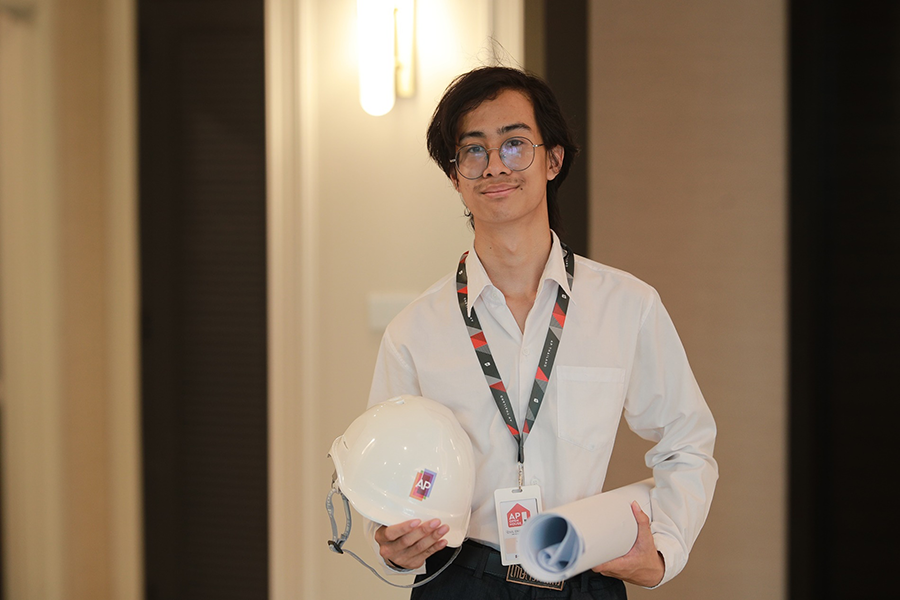 นายพันเพชร จิ่งตามน จากคณะบริหารธุรกิจ มหาวิทยาลัยศรีนครินทรวิโรฒ เล่าว่า “ตอนแรกกังวล ว่าจะเรียนหรือตามทันเพื่อนคนอื่นที่เป็นสายตรงด้านอสังหาริมทรัพย์หรือไม่ ซึ่งพี่ๆ ที่เอพีก็ได้ให้กำลังใจ และคอยแนะนำตลอด ผมได้เรียนรู้การดีไซน์และนวัตกรรมที่เอพีพัฒนาขึ้นมาโดยเฉพาะ รวมถึงการทำเวิร์กชอปเพื่อค้นหา Unmet Need ของพี่ๆ ผู้พิการ โดยจะนำข้อมูลที่ได้นี้ไปทำไฟนอลโปรเจกต์เรื่องการออกแบบที่อยู่อาศัยเพื่อทุกคน มีชีวิตดีๆ ที่เลือกเองได้ ต่อไป”