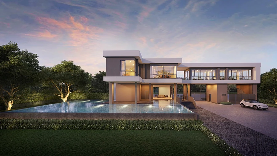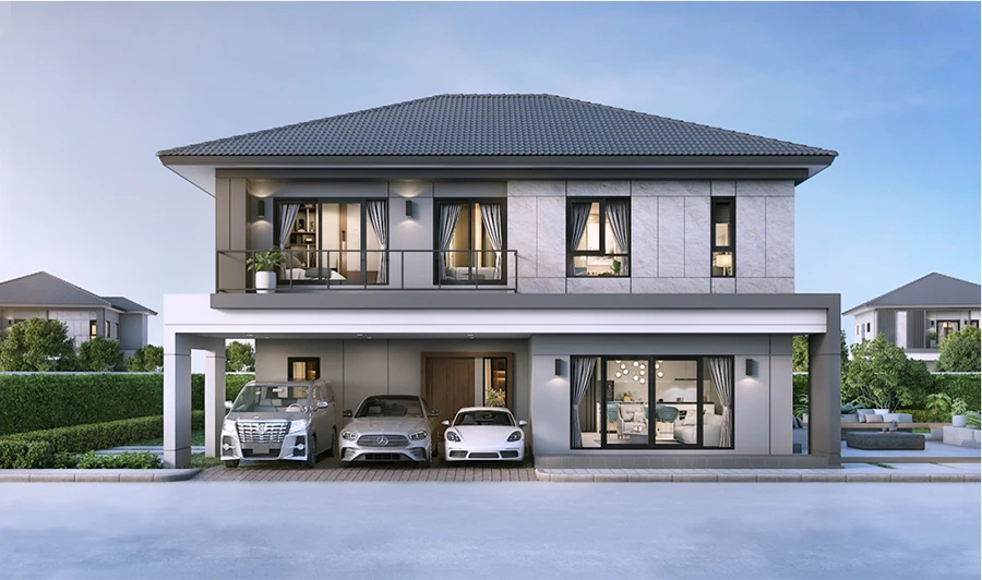 3 ห้องน้ำ 1 ห้องรับแขก และ 2 ที่จอดรถ จนถึง 4 ห้องนอน 5 ห้องน้ำ 2 ห้องรับแขก 1 ห้องเมท และ 3