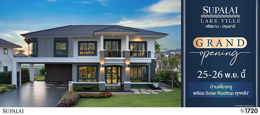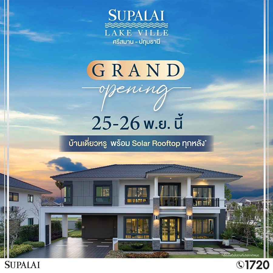 บริษัท ศุภาลัย จำกัด (มหาชน) เตรียมจัดงาน “Grand Opening” เปิดคลับเฮาส์ ชมสวนส่วนกลางขนาดใหญ่ที่ “ศุภาลัย เลควิลล์ ศรีสมาน-ปทุมธานี” บ้านเดี่ยวหรู 2 ชั้น ฟังก์ชันใหม่ Tropical Modern Series กับ 7 แบบบ้านหลากหลายสไตล์ เริ่มต้น 178 – 417 ตารางเมตร (4-6 ห้องนอน 3-7 ห้องน้ำ 2 โซนนั่งเล่น 2-3 ที่จอดรถ) ราคาเริ่มต้น 6.99-19 ล้านบาท* พร้อมติดตั้ง Solar Rooftop ให้บ้านทุกหลัง* พิเศษ! เมื่อจองภายในงานรับส่วนลดสูงสุด 1 ล้านบาท* และรับบัตรกำนัล SB Furniture มูลค่า 100,000 บาท* พบกันวันที่ 25-26 พ.ย.นี้