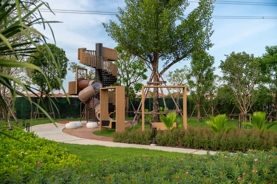 เชื่อมต่อศาลาพักผ่อนขนาดใหญ่ อีกทั้งยังมีลานอเนกประสงค์ขนาดใหญ่รองรับทุกกิจกรรม พร้อมสนามเด็กเล่น ไฮไลท์คือ Slider & Viewing Platform เครื่องเล่นสำหรับเด็กหลายช่วงวัย ด้านหน้าโครงการยังมีสิ่งอำนวยความสะดวกสบายมากมาย คลับเฮาส์ 2 ชั้น ภายในมี Co-Living Space สามารถนั่งทำงานหรือนั่งประชุมได้ และโซนออกกำลังกาย ฟิตเนสกับสระว่ายน้ำระบบน้ำแร่ เหมาะสำหรับสายแอคทีฟ