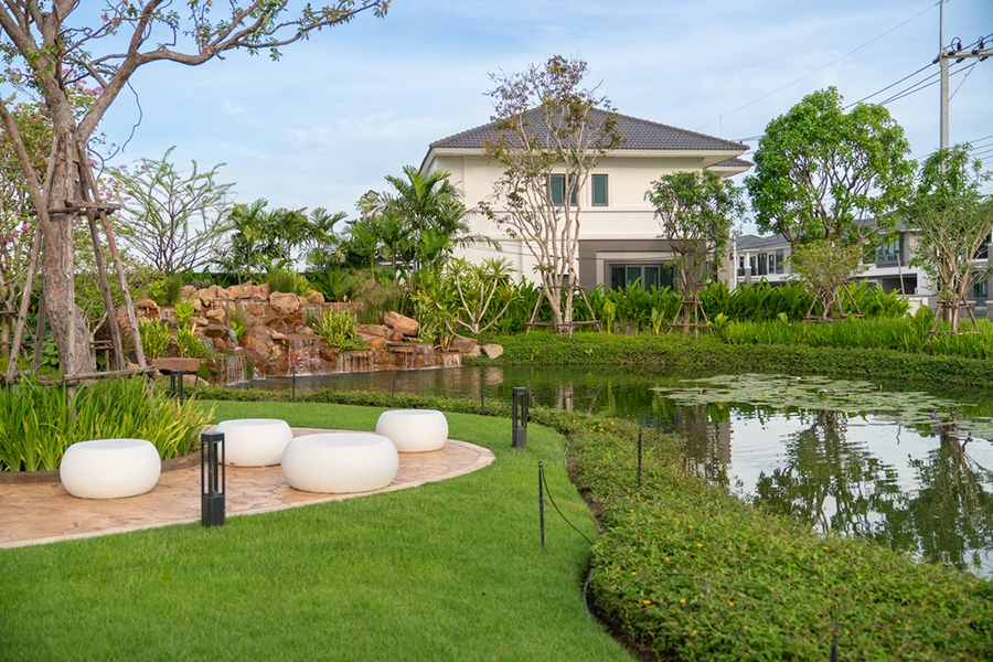 ศุภาลัย เลควิลล์ ศรีสมาน-ปทุมธานี บ้านเดี่ยวหรู 2 ชั้นขนาดใหญ่ บนทำเลศักยภาพ ใกล้ถนนราชพฤกษ์ตัดใหม่และทางด่วนศรีสมาน สร้างสรรค์โครงการภายใต้โปรเจกต์ “Green Concept” บนพื้นที่กว่า 85 ไร่ เน้นการอยู่อาศัยและใช้ชีวิตโอบล้อมใกล้ชิดธรรมชาติ พร้อมเปิดโซนพักผ่อนบนพื้นที่สีเขียวอย่างเป็นทางการกับ สวนส่วนกลางขนาดใหญ่กว่า 2 ไร่ ตกแต่งสไตล์ “Tropical Garden” ให้บรรยากาศร่มรื่นจากต้นไม้นานาชนิด สูดอากาศได้เต็มปอด พร้อมทางเดินรอบสวนที่เชื่อมทุกโซนเข้าถึงกัน ไฮไลท์...โดดเด่นกับ “มุมน้ำตก” ชวนสัมผัสเสียงผ่อนคลายจากสายน้ำที่ตกกระทบลำธาร ถัดมาเป็นโซน Welcome Court