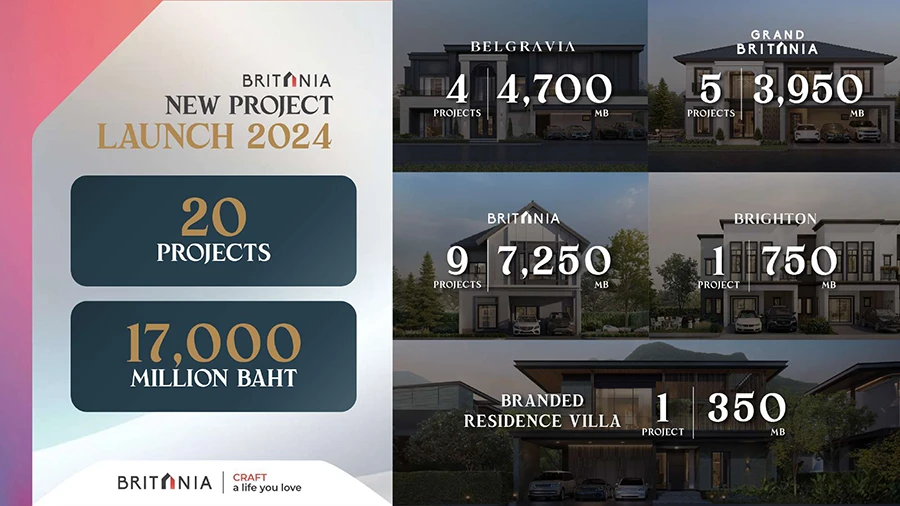 สำหรับบริษัท บริทาเนีย จำกัด (มหาชน) หรือ BRI เป็นผู้พัฒนาบ้านจัดสรรภายใต้คอนเซปต์ CRAFT a life you love ดีที่สุดคือใช้ชีวิตในแบบที่รัก พัฒนาทั้งบ้านเดี่ยว บ้านซีรีส์ใหม่ ทาวน์โฮม ครอบคลุมผู้บริโภคทุกเซ็กเมนท์ ภายใต้ 4 แบรนด์หลัก ได้แก่ 1.เบลกราเวีย (Belgravia) บ้านเดี่ยวลักชัวรี ระดับราคา 20-50 ล้านบาท 2.แกรนด์ บริทาเนีย (Grand Britania) บ้านเดี่ยวและบ้านแฝดระดับ High-End ราคา 8-20 ล้านบาท 3.บริทาเนีย (Britania) บ้านเดี่ยว บ้านแฝด และทาวน์โฮม ระดับ Mid-end ราคา 4-8 ล้านบาท และ 4.ไบรตัน (Brighton) บ้านแฝด และทาวน์โฮม ระดับเริ่มต้น (Entry) ราคา 2.5-4 ล้านบาท โดย ณ สิ้นปี 2566 พัฒนาโครงการมาแล้วทั้งสิ้น 42 โครงการ คิดเป็นมูลค่าโครงการสะสม 53,772 ล้านบาท