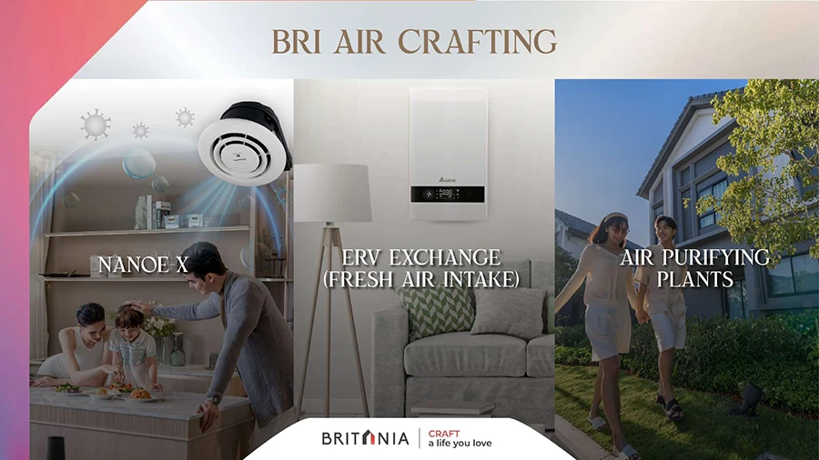 - Happiness Crafting รังสรรค์เพื่อความสุข สร้างแบรนด์บริทาเนียให้เป็นแบรนด์แห่งความสุข ด้วยหลากหลายนวัตกรรมและบริการภายในบ้าน รังสรรค์นวัตกรรมที่แตกต่าง ตอบโจทย์การใช้ชีวิตยุคใหม่อย่างมีความสุขของทุกคนในครอบครัว เช่น Air Crafting เพิ่มอากาศบริสุทธ์ทั้งในพื้นที่ส่วนกลางและภายในบ้านด้วยระบบฟอกอากาศ nanoe™X เทคโนโลยีในเครื่องปรับอากาศและเครื่องฟอกอากาศของ Panasonic ที่ช่วยยับยั้งไวรัส ดูแลคนที่รักให้รู้สึกสบาย มีสุขภาพดี และเครื่องแลกเปลี่ยนอากาศติดผนัง ERV (Energy Recovery Ventilator) ทำหน้าที่ระบายอากาศเสียออกจากห้อง พร้อมทั้งนำอากาศบริสุทธิ์จากภายนอกเข้ามาผ่าน Filter กรองฝุ่นและ PM2.5 และลดอุณภูมิอากาศที่เติมเข้ามาผ่านตัวแลกเปลี่ยนความร้อนทำให้ประหยัดพลังงาน และ Britania Craft Services ร่วมมือกับบริษัท พรีโม เซอร์วิส โซลูชั่น จำกัด (มหาชน) หรือ PRI มอบบริการทำความสะอาด อบโอโซน ล้างแอร์ ดูแลสวน ตรวจเช็คระบบไฟฟ้าและระบบประปา ถึงภายในบ้าน ฟรีสูงสุด 3 ปี*
