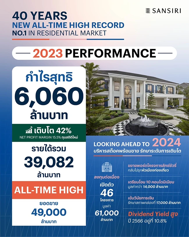 นายวิชาญ วิริยะภูษิต ประธานผู้บริหารสายงานการเงิน บริษัท แสนสิริ จำกัด (มหาชน) หรือ SIRI ผู้ประกอบธุรกิจพัฒนาอสังหาริมทรัพย์ชั้นนำของไทย เปิดเผยว่า "ปี 2566 แสนสิริสามารถสร้างผลการดำเนินงานได้อย่างมีประสิทธิภาพ โดยมีกำไรสุทธิสูงถึง 6,060 ล้านบาท ซึ่งนับว่าสูงที่สุดเป็นประวัติการณ์ นับตั้งแต่ก่อตั้งมาได้ 40 ปี หรือ ALL-TIME HIGH เพิ่มขึ้น 42% จากปี 2565 ที่มีกำไรสุทธิ 4,280 ล้านบาท หรือคิดเป็นอัตรากำไรสุทธิ (Net Profit Margin) ที่ 15.5% ทุบสถิติใหม่ นับว่าเป็นบริษัทที่มีอัตราการเติบโตด้านกำไรสุทธิสูงที่สุดในกลุ่มธุรกิจอสังหาริมทรัพย์ขณะนี้ ส่วนยอดขายรวมอยู่ที่ 49,000 ล้านบาท ด้านรายได้รวมก็ถือเป็นสถิติสูงสุดใหม่เช่นกันอยู่ที่ 39,082 ล้านบาท เพิ่มขึ้น 12% จากปีก่อนหน้า ซึ่งมาจากการเปิดตัวโครงการใหม่ทั้งแนวราบและแนวสูง โดยเฉพาะโครงการบ้านเดี่ยวที่แสนสิริเป็นเจ้าตลาดอสังหาฯ ในระดับลักซ์ชัวรี่และมียอดโอนเข้ามาอย่างต่อเนื่อง อาทิ โครงการนาราสิริ กรุงเทพกรีฑา, เศรษฐสิริ ดอนเมือง, นาราสิริ พหล-วัชรพล, บูก้าน กรุงเทพกรีฑาและบุราสิริ วัชรพล ในส่วนของคอนโดมิเนียมพร้อมอยู่ หรือ Ready to Move ที่สามารถขายและรับรู้รายได้ได้ทันที อาทิ โครงการเอ็กซ์ที พญาไท, เอ็กซ์ที ห้วยขวาง, ดีคอนโด พนา, โอกะ เฮ้าส์, เอดจ์ เซ็นทรัล พัทยา, เดอะ เบส เพชรบุรี-ทองหล่อ และเดอะ มูฟ บางนา สิ่งที่สำคัญและปัจจัยหลักที่ทำให้ธุรกิจเติบโตอย่างก้าวกระโดด เป็นผลจากการตอบรับในแบรนด์ที่อยู่อาศัยของแสนสิริ ที่ได้รับความเชื่อมั่นจากลูกค้าที่ดีมาโดยตลอด โดยเฉพาะการครองใจกลุ่มลูกค้าลักซ์ชัวรี่และซูเปอร์ลักซ์ชัวรี่ด้วยคุณภาพและบริการจากแสนสิริที่เหนือกว่า ผ่านประสบการณ์จริงของลูกค้าที่ได้สัมผัส ทำให้ลูกค้าเชื่อมั่นในมาตรฐานสินค้าและบริการ จนส่งผลให้แสนสิริเป็นเบอร์หนึ่งผู้นำอสังหาฯ ลักซ์ชัวรี่จนถึงปัจจุบัน รวมถึงการควบคุมวินัยทางการเงินของบริษัทฯ เป็นอย่างดี การบริหารงานก่อสร้างอย่างมีประสิทธิภาพเพื่อส่งมอบที่อยู่อาศัยคุณภาพให้กับลูกค้า ทั้งหมดส่งผลให้แสนสิริมีประสิทธิภาพในการทำกำไรและสร้างรายรับให้มีศักยภาพสูงยิ่งขึ้น"