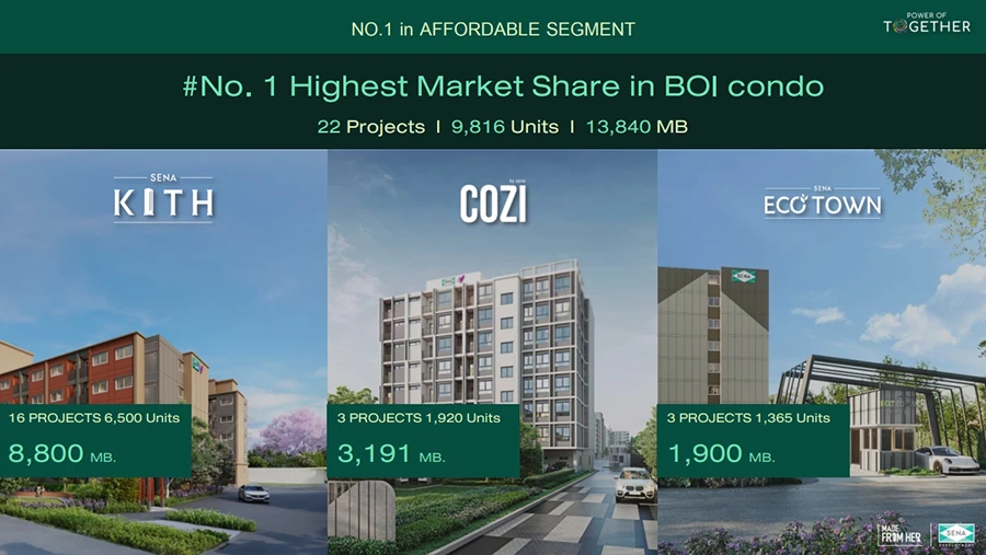 FOCUS : ให้ความสำคัญ และเจาะลึกเรื่อง segmentation มากขึ้น เน้นกลุ่มเรียลดีมานด์ที่สามารถซื้อบ้านได้ที่ราคาไม่เกิน 1 ล้านบาท ไปจนถึง 3.6 ล้านบาท หรือมีรายได้ไม่เกิน 30,000 บาทต่อเดือน ซึ่งเป็นกลุ่มที่มากที่สุด มีถึง 54% เทียบจากรายได้ครัวเรือนของคนกรุงเทพและปริมณฑล ซึ่งตรงกับบ้านหรือคอนโดในกลุ่ม Affordable Segment ที่เป็นสินค้าหลักของกลุ่มเสนาที่มีความเชี่ยวชาญอยู่แล้ว โดยปัจจุบันเสนามีโครงการพร้อมขายทั้งหมด 99 โครงการ หรือคิดเป็นมูลค่ารวมราว 116,396 ล้าน เป็นสัดส่วนของ Affordable segment ที่ 47 โครงการ มูลค่า 37,409 โดยตั้งเป้าขึ้นเป็นผู้นำในเซ็กเมนท์นี้ ขณะเดียวกันก็พร้อมจะขึ้นมาครองส่วนแบ่งตลาดอันดับหนึ่งของกลุ่ม BOI คอนโด พร้อมกันด้วย (โดยกลุ่มนี้ ณ ข้อบังคับปัจจุบันต้องมีราคาไม่เกิน 1.2 ล้าน และต้องมีพื้นที่ 24 ตร.ม.ขึ้นไป) ซึ่งปัจจุบันเสนามีอยู่ทั้งหมด 22 โครงการภายใต้แบรนด์ SENA KITH, COZI และ ECO TOWN รวม 9,785 ยูนิต หรือมูลค่าโครงการรวมเกือบ 13,900 ล้านบาท