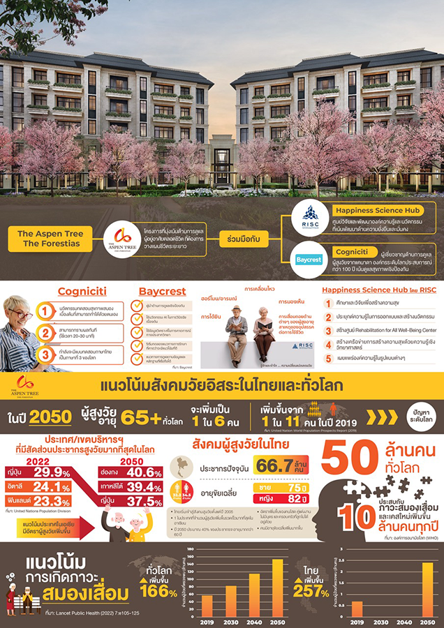 ดิ แอสเพน ทรี เดอะ ฟอเรสเทียส์ (The Aspen Tree The Forestias) โครงการที่อยู่อาศัยเพื่อวัยอิสระ ร่วมกับ เบย์เครสต์ (Baycrest) ผู้เชี่ยวชาญด้านการดูแลผู้สูงวัยระดับโลกจากแคนาดา และ ศูนย์วิจัยและนวัตกรรมเพื่อความยั่งยืนภายใต้ MQDC (RISC by MQDC) ร่วมศึกษาและพัฒนางานวิจัยเชิงลึกด้านสมอง การชะลอความเสื่อมและหาแนวทางป้องกันโรคทางสมองที่เกิดจากความเสื่อมตามวัย รวมถึงวิจัยศาสตร์แห่งความสุข ซึ่งนับเป็นก้าวสำคัญทางวิทยาศาสตร์ที่เกิดการพัฒนาองค์ความรู้ใหม่โดยนักวิจัยและผู้เชี่ยวชาญ อีกทั้งเป็นก้าวสำคัญในการยกระดับการพัฒนาที่อยู่อาศัยเพื่อวัย 50+ อย่างแท้จริง ตอบโจทย์สังคมสูงวัยซึ่งเป็นปัญหาระดับโลกและในประเทศไทย อีกทั้งผู้ป่วยโรคสมองเสื่อมในประเทศไทย จะเพิ่มขึ้นในอัตราที่สูงกว่าค่าเฉลี่ยของโลกในอีก 30 ปีข้างหน้า ทั้งนี้โครงการที่อยู่อาศัย ดิ แอสเพน ทรี จะเป็นแห่งแรกในโลกที่ได้นำผลงานวิจัยเชิงลึกนี้ไปประยุกต์ใช้จริง เพื่อการดูแลผู้อยู่อาศัยตลอดชีวิต (Holistic Lifetime Care) เน้นการดูแลสุขภาพเชิงป้องกัน ส่งเสริมสุขภาพสมอง และการมีคุณภาพชีวิตที่ดี ปลอดภัย มีความสุข