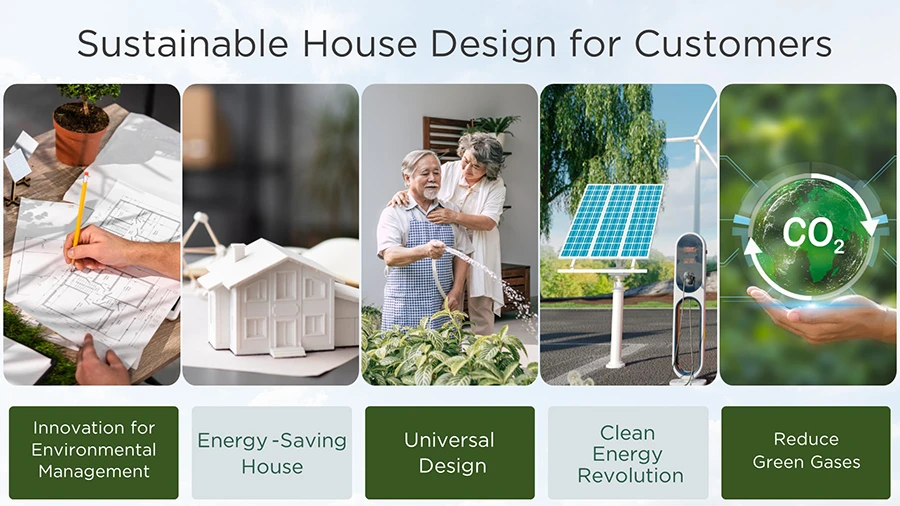 - การออกแบบเพื่อคนทุกวัย (Universal Design) โดยบริษัทฯ คำนึงถึงการออกแบบฟังก์ชันภายในบ้าน และการใช้งานต่างๆ เพื่อรองรับทุกเพศ ทุกวัยให้ได้รับความสะดวกสบาย ความปลอดภัยอย่างเท่าเทียมกัน โดยเฉพาะฟังก์ชันเพื่อตอบโจทย์ผู้สูงอายุ และผู้พิการ ออกแบบห้องนอนในชั้นล่าง พร้อมใช้วัสดุปูพื้นที่ช่วยลดการลื่นและการกระแทก ออกแบบบานประตูเลื่อน ไม่มีธรณีประตู ลดความต่างระดับ สำหรับกรณีการใช้รถเข็นได้สะดวกยิ่งขึ้น