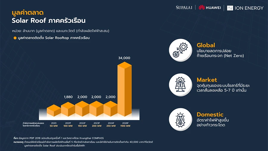 นายพงศภัค นครศรี กรรมการบริหาร บริษัท ไอออน เอนเนอร์ยี่ คอร์ปอเรชั่น จำกัด หรือ ION ผู้นำธุรกิจจัดหาโซลูชั่นพลังงานสะอาดจากแสงอาทิตย์ครบวงจร ตั้งแต่การออกแบบ จัดหา และติดตั้ง รวมถึงการดูแลบริการหลังการขายสำหรับภาคครัวเรือน อสังหาริมทรัพย์ และองค์กรธุรกิจขนาดกลางและขนาดย่อม กล่าวว่า ปัจจุบันทั่วโลกมีแนวโน้มการใช้พลังงานไฟฟ้าจากพลังงานหมุนเวียนซึ่งเป็นแหล่งพลังงานที่ได้รับความนิยมอย่างแพร่หลาย เพื่อลุยภารกิจพิชิต Net Zero สู่อนาคตที่ยั่งยืน เทรนด์ติดตั้ง Solar Roof มีเพิ่มมากขึ้นอย่างเห็นได้ชัดโดยเฉพาะกลุ่มที่อยู่อาศัย (Residential) ด้วยเหตุผลภาระค่าไฟฟ้าที่กำลังเพิ่มขึ้น เนื่องจากความผันแปรของต้นทุนการผลิตไฟฟ้าและการซื้อไฟฟ้า ส่งผลให้ค่า FT มีการปรับตัวสูงขึ้น หากมีพฤติกรรมการใช้พลังงานไฟฟ้ามากขึ้น ก็จะทำให้ภาพรวมภาระค่าไฟฟ้าต่อเดือนยังคงอยู่ในระดับสูง อีกทั้งยังเพิ่มการปล่อยก๊าซเรือนกระจกซึ่งส่งผลให้อุณหภูมิของโลกสูงขึ้นอีกด้วย การเลือกใช้งานไฟฟ้าจากแหล่งพลังงานสะอาดจึงเป็นเรื่องสำคัญที่ทุกคนควรร่วมมือกันผลักดันเพื่อให้เกิดประโยชน์ในทุกภาคส่วนของสังคมและสิ่งแวดล้อม