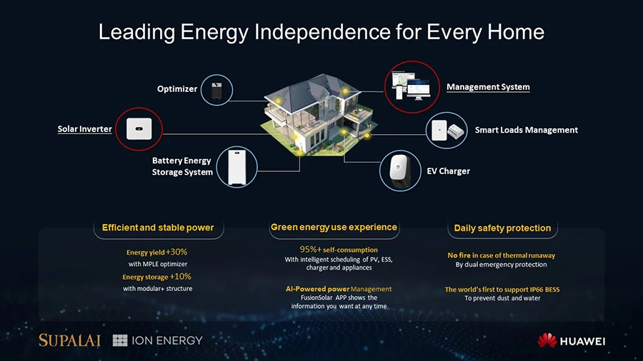 นายโลแกน ยู ประธานกรรมการกลุ่มธุรกิจดิจิทัลพาวเวอร์ บริษัท หัวเว่ย เทคโนโลยี่ (ประเทศไทย) จํากัด เปิดเผยว่า บริษัทฯ มุ่งมั่นที่จะขับเคลื่อนการใช้พลังงานสะอาดเพื่ออนาคตที่เป็นมิตรกับสิ่งแวดล้อมมาอย่างต่อเนื่อง ในฐานะผู้นำด้านเทคโนโลยีพลังงานสะอาด ผู้ออกแบบโซลูชันอุปกรณ์แปลงผันกำลังไฟฟ้า ระบบกักเก็บพลังงาน ตลอดจนระบบการจัดการและแสดงผลอัจฉริยะด้านดิจิทัลพาวเวอร์สำหรับทั้งภาคธุรกิจและครัวเรือน หัวเว่ยจะดำเนินตามเป้าหมายเรื่องการส่งเสริมให้ทั้งภาคองค์กรและครัวเรือนในประเทศไทย ร่วมติดตั้งระบบโซลาร์เซลล์ผ่านความร่วมมือกับพาร์ทเนอร์รายสำคัญของเราในประเทศไทย โดยหัวเว่ยจะสนับสนุนองค์ความรู้ทางด้านวิชาการและเทคโนโลยี รวมทั้งช่วยพัฒนาโมเดลธุรกิจและการออกแบบระบบผลิตไฟฟ้าพลังงานแสงอาทิตย์ผ่านโปรแกรม Smart Design 2.0 สำหรับกลุ่มที่อยู่อาศัยและภาคธุรกิจของบมจ.ศุภาลัย โดยร่วมกับไอออน เอเนอร์ยี่ ในการสนับสนุนด้านการประชาสัมพันธ์เพื่อโปรโมทโซลูชันพลังงานแสงอาทิตย์ให้เป็นที่รู้จักมากขึ้นในประเทศไทย
